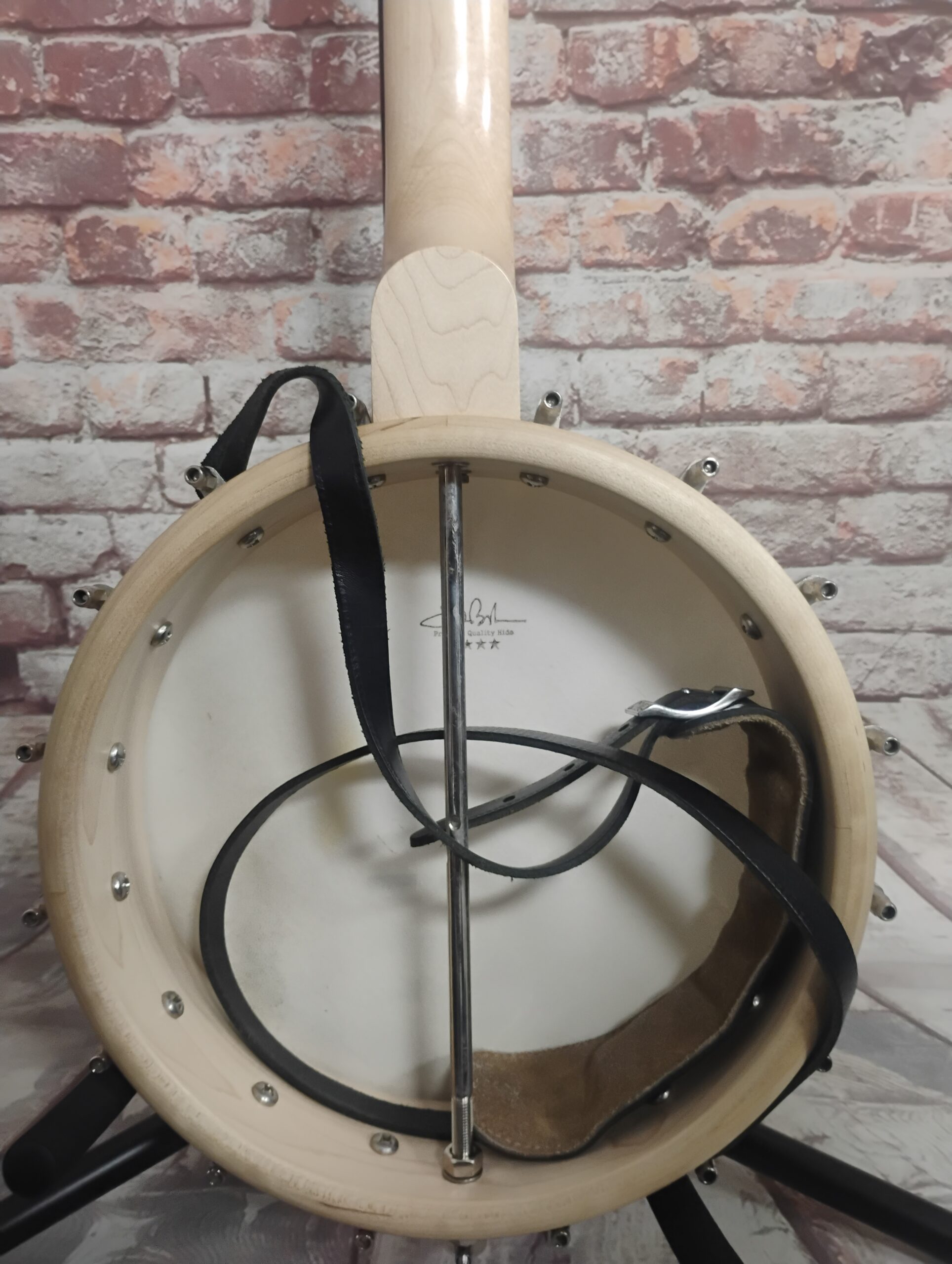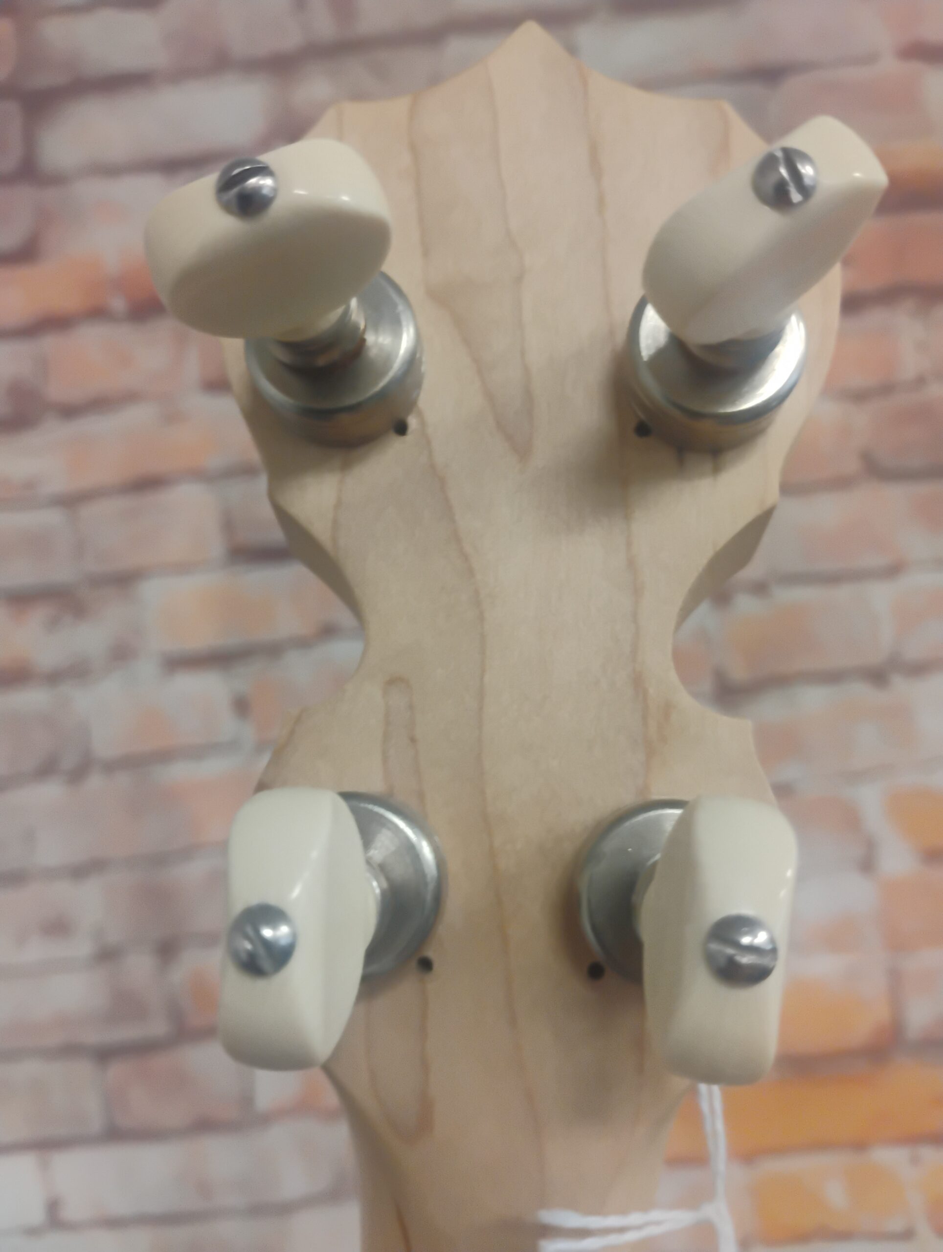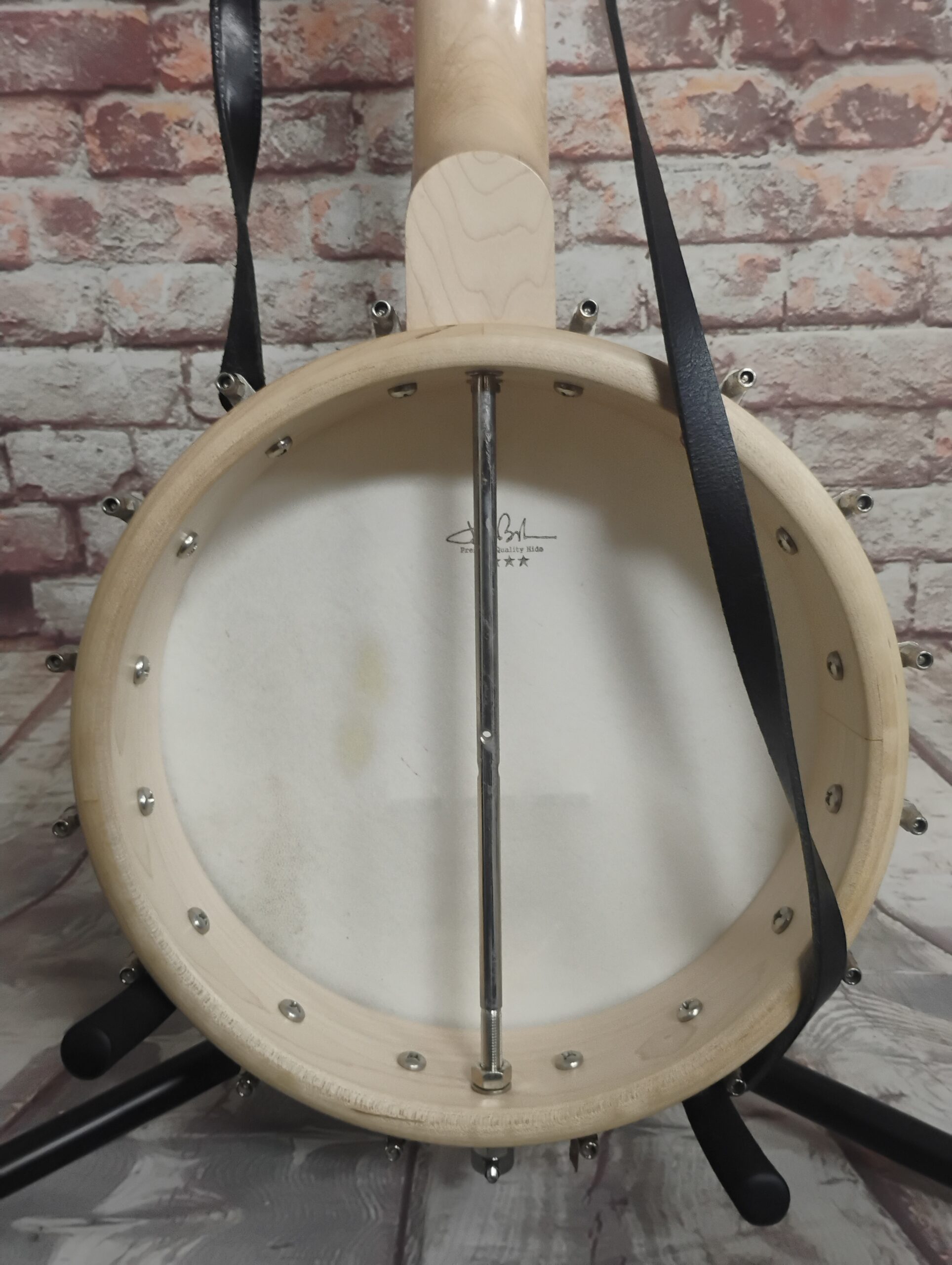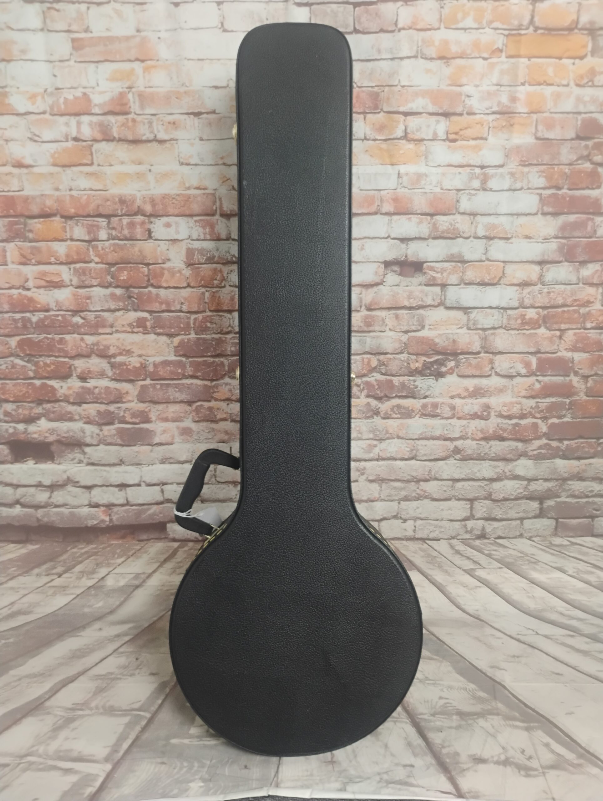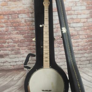 This banjo sounds great with loud resonance, low action and a great feeling neck. The head on this banjo has some signs of use but nothing that affects the sound of functionality. The head has been upgraded to a JDBalch Premium quality hide head. The tuners have also been upgraded and there are holes that can be seen from the previous tuners, as shown in pictures.