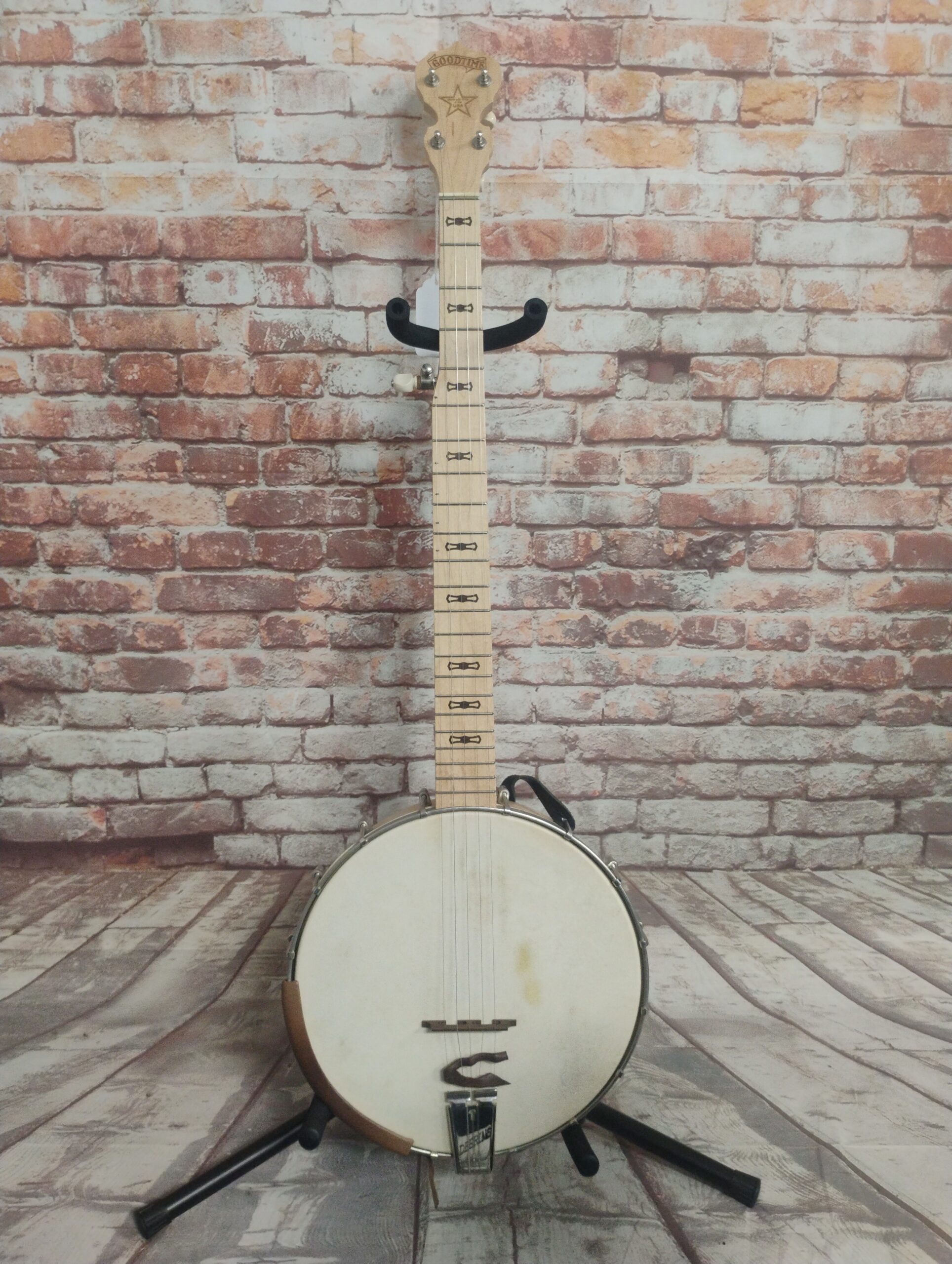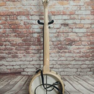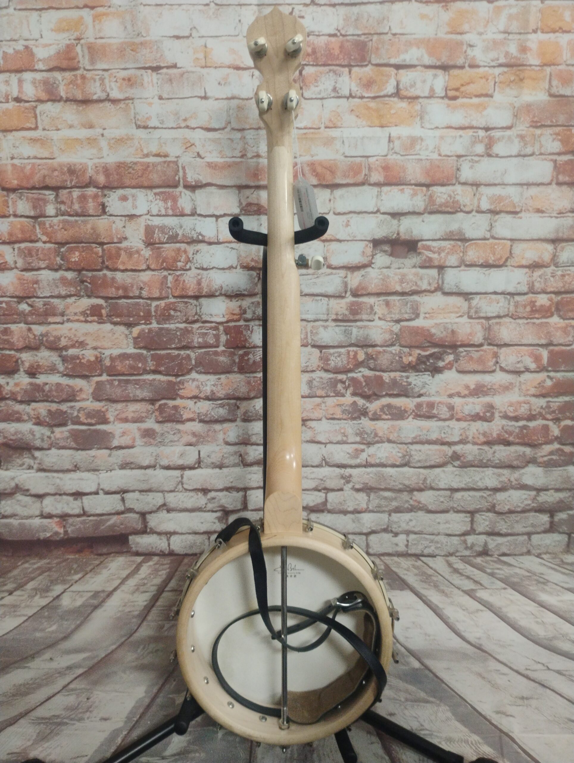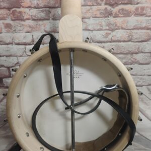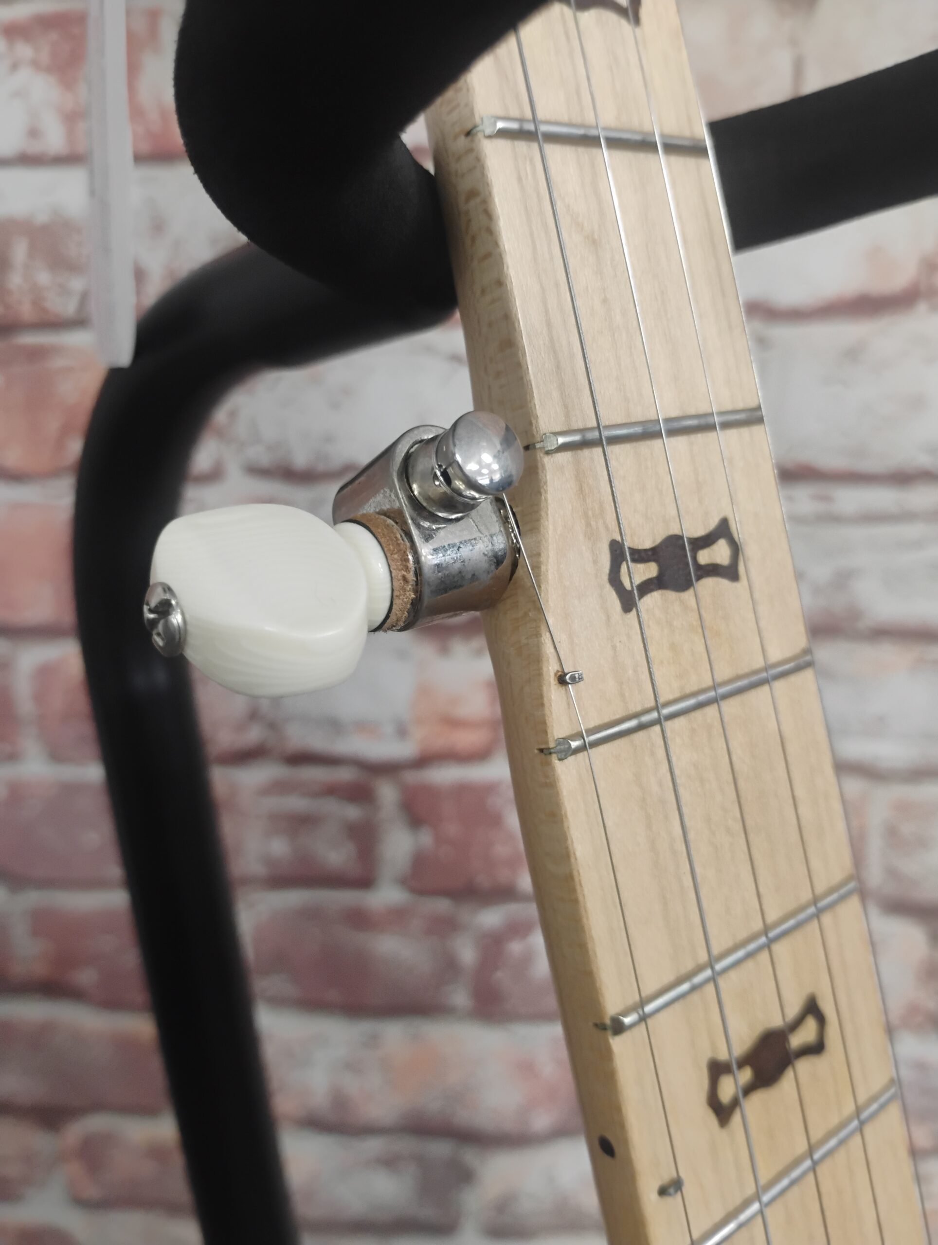This banjo sounds great with loud resonance, low action and a great feeling neck. The head on this banjo has some signs of use but nothing that affects the sound of functionality. The head has been upgraded to a JDBalch Premium quality hide head. The tuners have also been upgraded and there are holes that can be seen from the previous tuners, as shown in pictures.