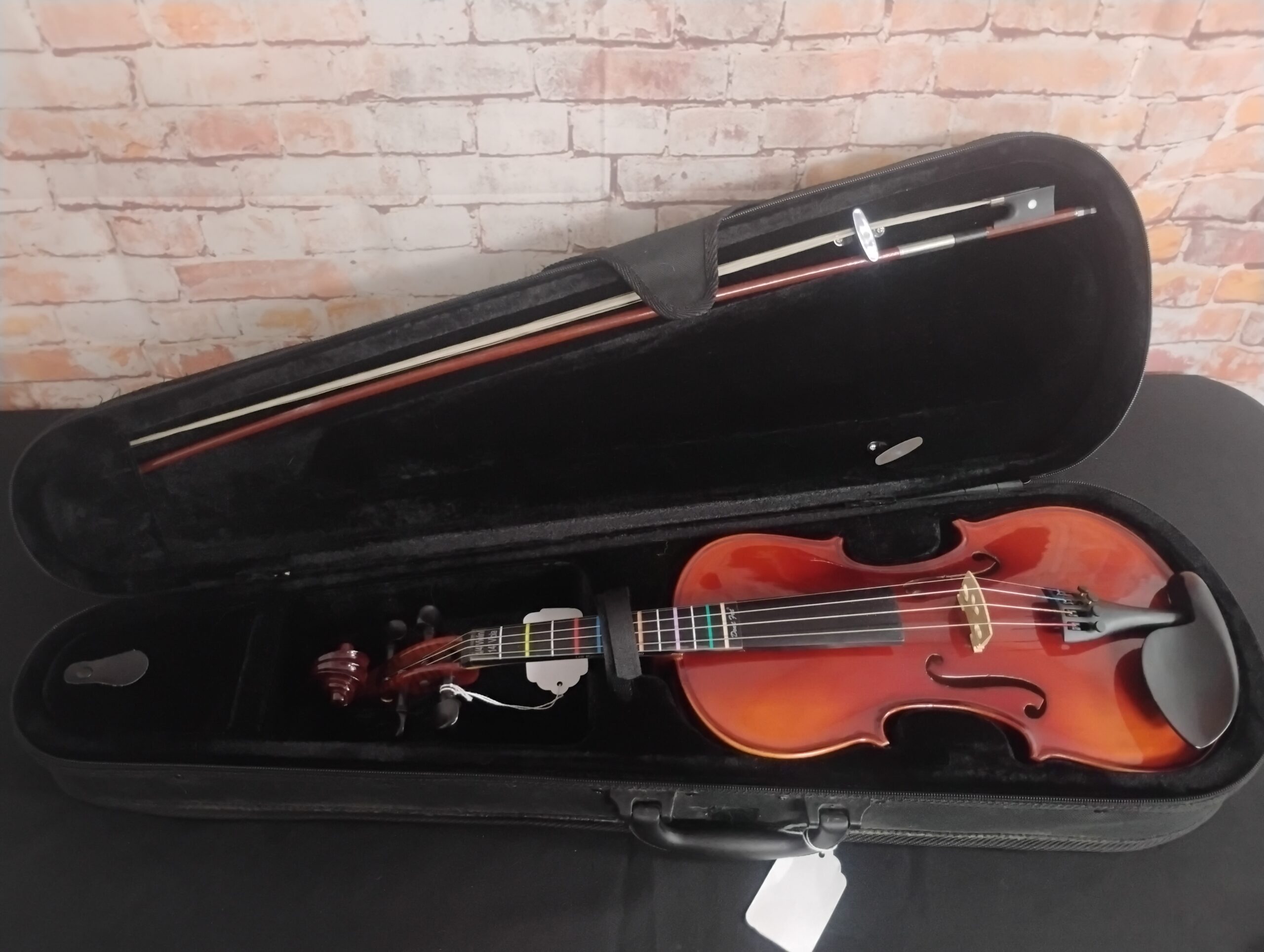 Used Hazelton 4/4 Violin, great condition and everything works as it should. The Fingerboard has a Don’t Fret 4/4 Violin Position marker sticker. Comes with Case, bow, rosin, case strap and velvet blanket.
